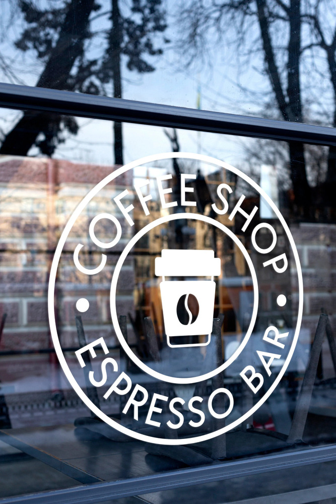 Glass window branding with vinyl lettering, logos, symbols, and shapes.